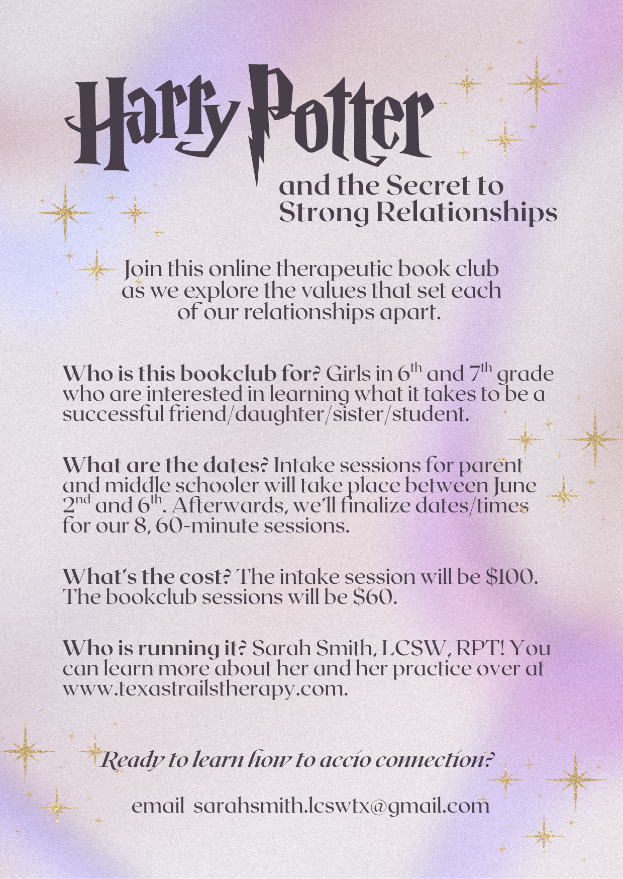 Email sarahsmith.lcswtx@gmail.com to register or for more information.